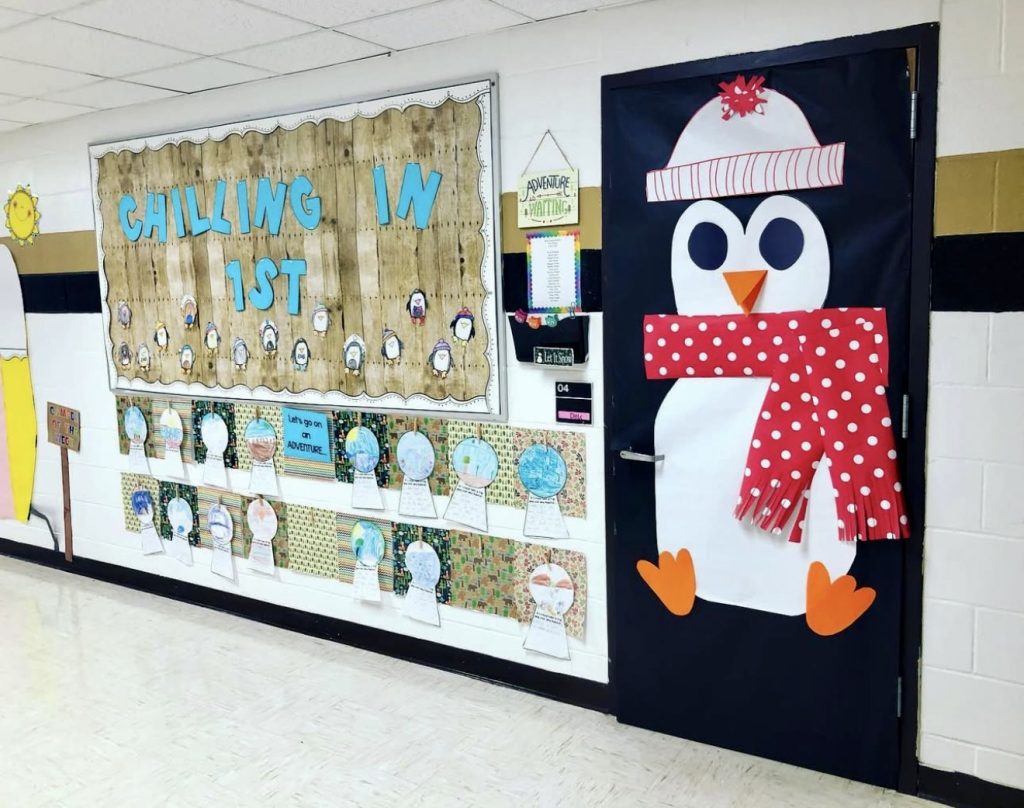 Featuring oversized, cheerful penguins bundled in hats and scarves, this door exudes warmth and whimsy. Popular in Preschool and Middle school settings, it evokes the comfort of sipping hot chocolate on a snowy day. Additionally, it can inspire lessons about animal habitats or folklore, such as igloo construction or mythical creatures like yetis.