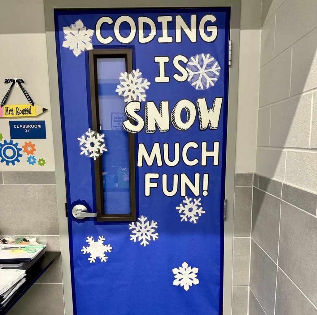 Emblazoned with the phrase “Coding is Snow Much Fun,” this door merges technology themes with winter aesthetics. White snowflakes stand out against a deep blue backdrop, making it perfect for STEM or Math classrooms. This design is straightforward to assemble yet impactful, encouraging students to see learning as an enjoyable adventure even during colder months.