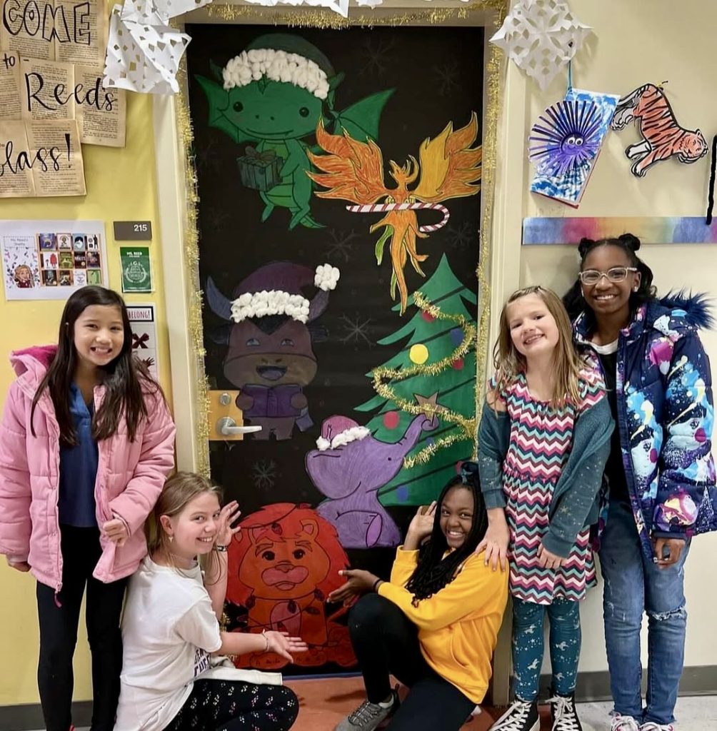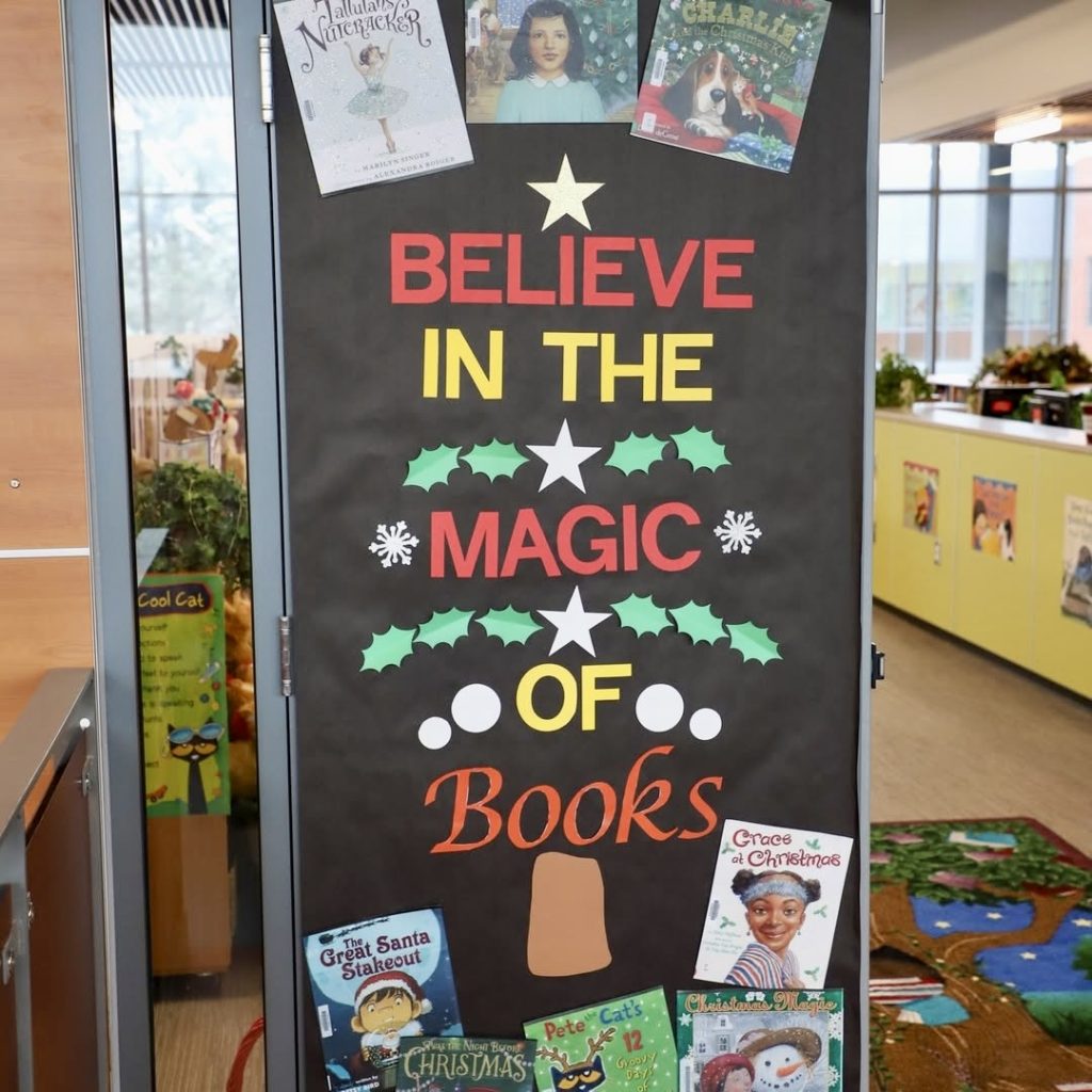 This Library-inspired door encourages students to “Believe in the Magic of Books,” with the message arranged in the shape of a tree. Surrounded by beloved holiday stories like The Nutcracker and Pete the Cat, it promotes reading during the colder months. This design resonates across all grade levels, blending seasonal charm with literacy encouragement.