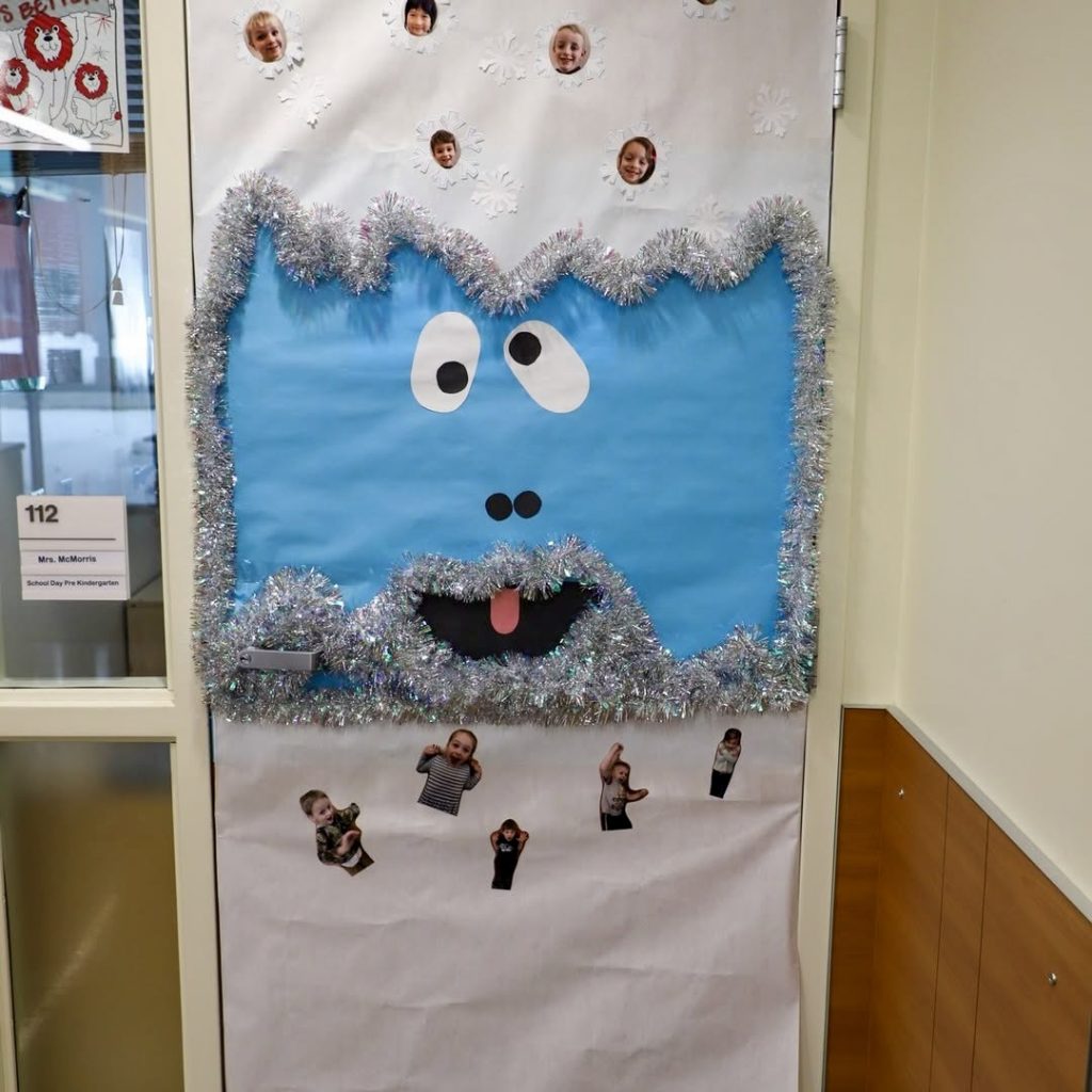 This bright blue yeti-themed door, framed with silver tinsel, features cutouts of students’ faces nestled in a snowy landscape. It’s a humorous and heartwarming design, perfect for Preschool and Infants classrooms. The concept fosters a sense of community by spotlighting the children themselves, making the decoration both personal and fun.