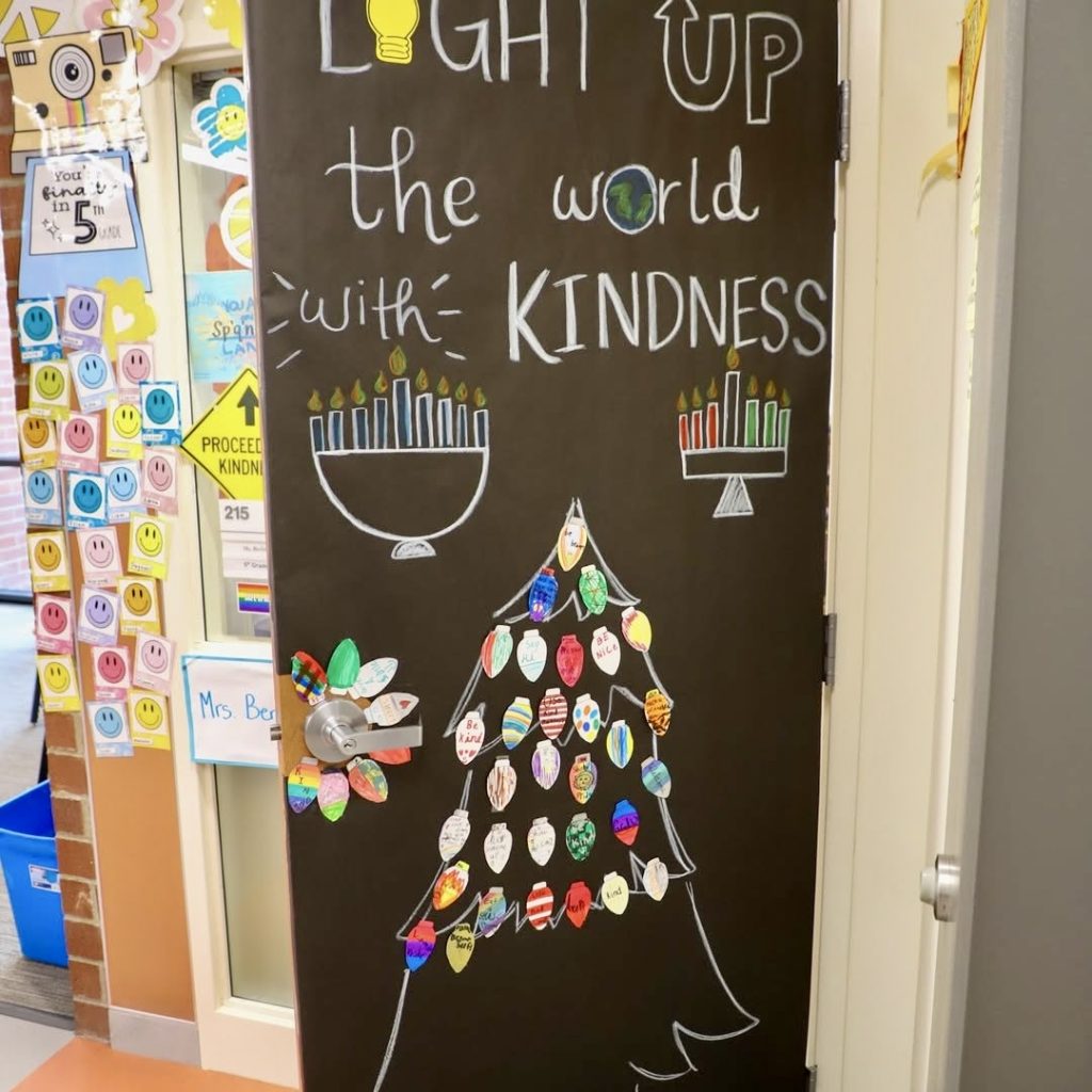 Featuring illustrated candles and a tree adorned with student-made ornaments, this door carries the heartfelt message “Light Up the World with Kindness.” It’s a beautiful reminder of community and compassion, suitable for Science, Math, or general classrooms. The design supports social-emotional learning by encouraging reflection on positive values.