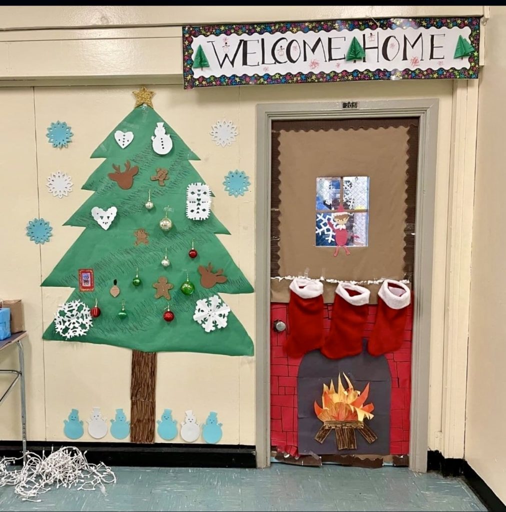 This imaginative door showcases a fantasy winter scene, complete with a festive tree, tinsel, and whimsical creatures. Students proudly display their artwork, making it an ideal collaborative project for High school classes. The blend of creativity, teamwork, and holiday spirit demonstrates how classroom decorations can be as engaging as any academic assignment.