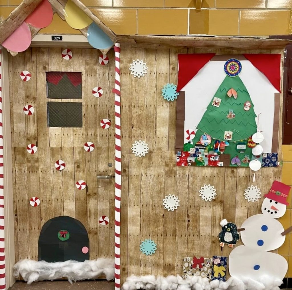 This immersive door transforms into a giant gingerbread house, complete with candy canes, peppermint swirls, and a smiling snowman. It’s a creative project that can tie into art and math lessons about measurement and design, making it suitable for Middle and High school students.