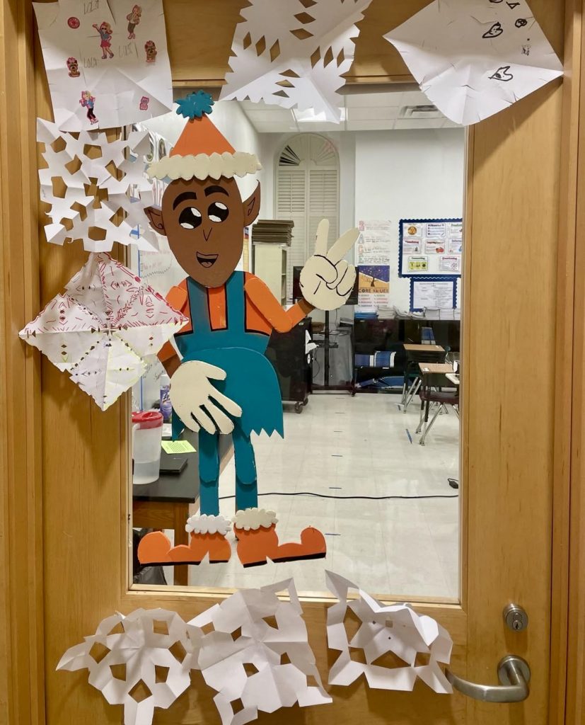 This door features a large classroom elf surrounded by hand-cut snowflakes crafted by students. It’s a whimsical and participatory design that encourages teamwork and seasonal spirit, perfect for engaging students in the decorating process.