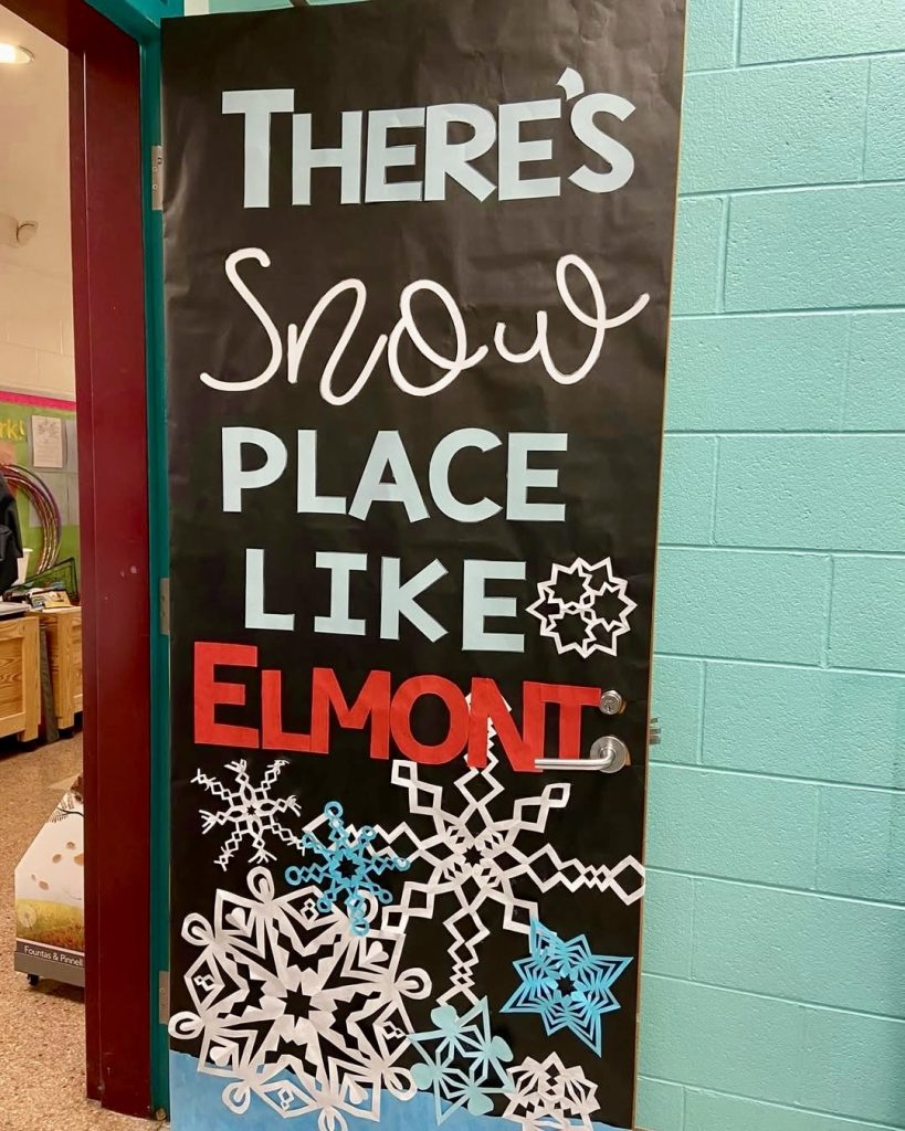 This bold design proclaims “There’s Snow Place Like Elmont,” featuring oversized snowflakes in various patterns. It’s a clever pun that combines school pride with winter themes, ideal for Middle and High school hallways. The typography and cut-out snowflakes create a striking visual with minimal effort.