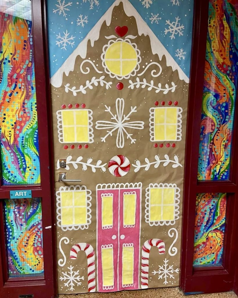 This door becomes a giant gingerbread house adorned with candy canes, frosting details, and snowy accents. The hand-painted style adds warmth and artistry, making it a wonderful project for both Preschool and High school art classes, linking creativity with seasonal traditions.
