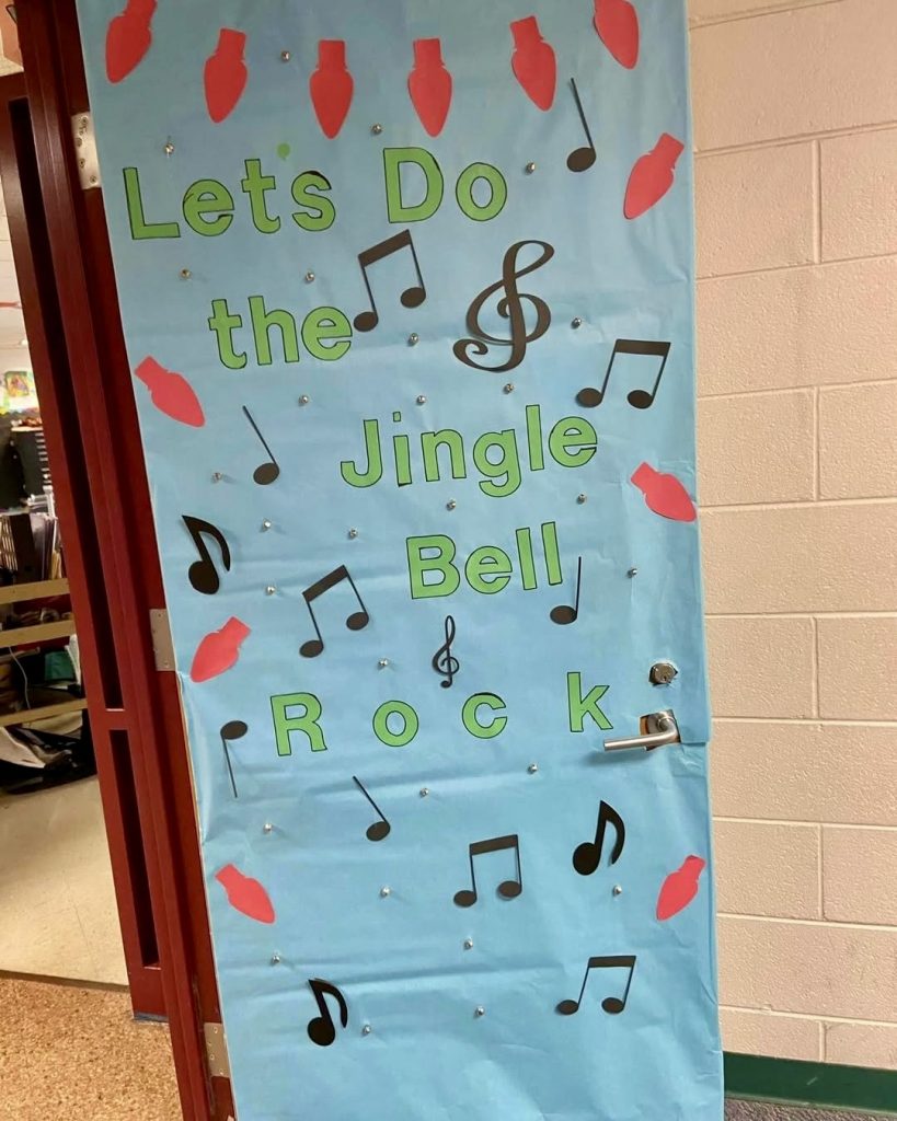 Featuring a bright blue background, black musical notes, and the phrase “Let’s Do the Jingle Bell Rock,” this door brings festive rhythm to the classroom. It’s perfect for Music rooms across all grades and can inspire sing-alongs or dance activities, connecting decor directly to curriculum.