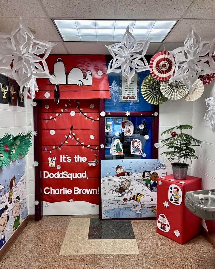 This nostalgic display honors Snoopy and Charlie Brown with oversized cutouts, string lights, and a paper tree. It resonates with students from Preschool through High school, celebrating storytelling and shared traditions in a unique and heartwarming way.