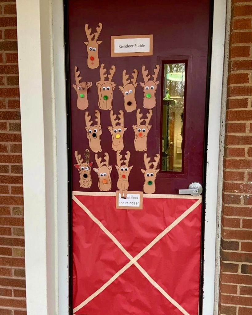 This fun door transforms into a “Reindeer Stable” featuring student-made reindeer faces with googly eyes and colorful noses. It’s a humorous and easy-to-create design, perfect for Preschool and Infants, that encourages student participation and ties into classic holiday themes.