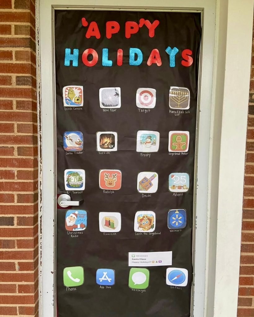 This witty door mimics a smartphone screen filled with holiday-themed apps like a Grinch camera, Santa tracker, and gingerbread maker. The pun “’Appy Holidays” adds humor, making it especially appealing to Middle and High school students immersed in tech culture.