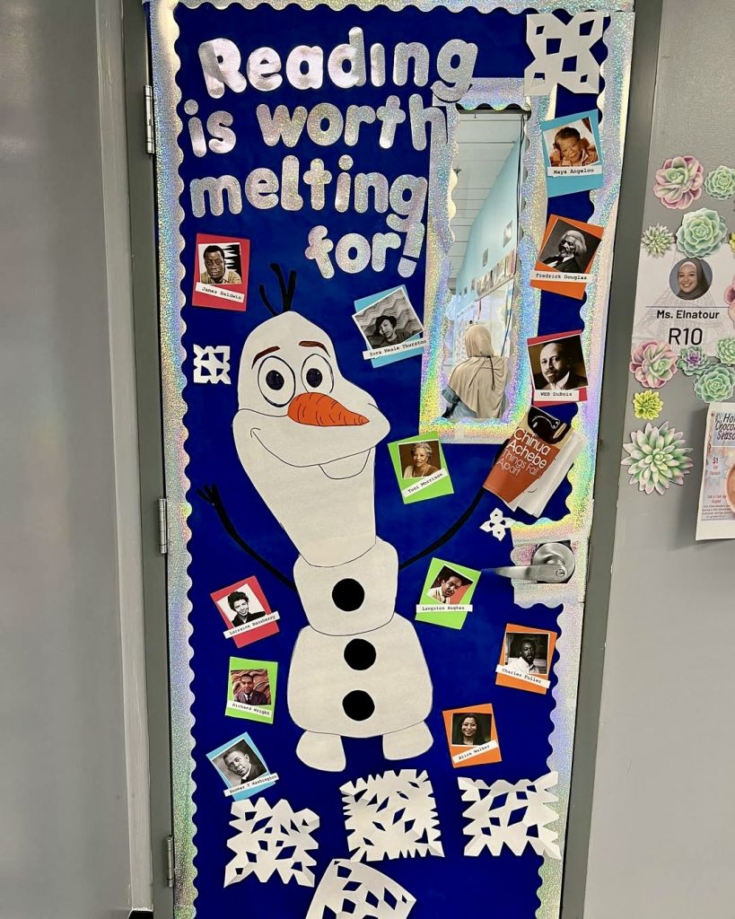 Centering on Olaf from Frozen, this literacy-themed door proclaims “Reading is worth melting for.” Surrounded by portraits of famous authors, it’s a motivating display for Libraries and High school classrooms, blending Disney charm with academic encouragement.