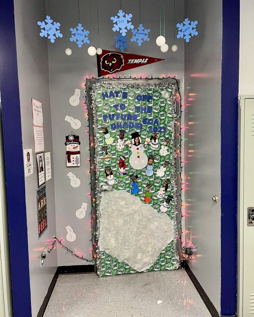 Adorned with snowmen, tinsel, and bright lights, this door honors students on their path to graduation with the phrase “Hats Off to the Future Grads.” It’s an inspiring and festive design perfect for High school hallways, combining holiday cheer with forward-looking motivation.