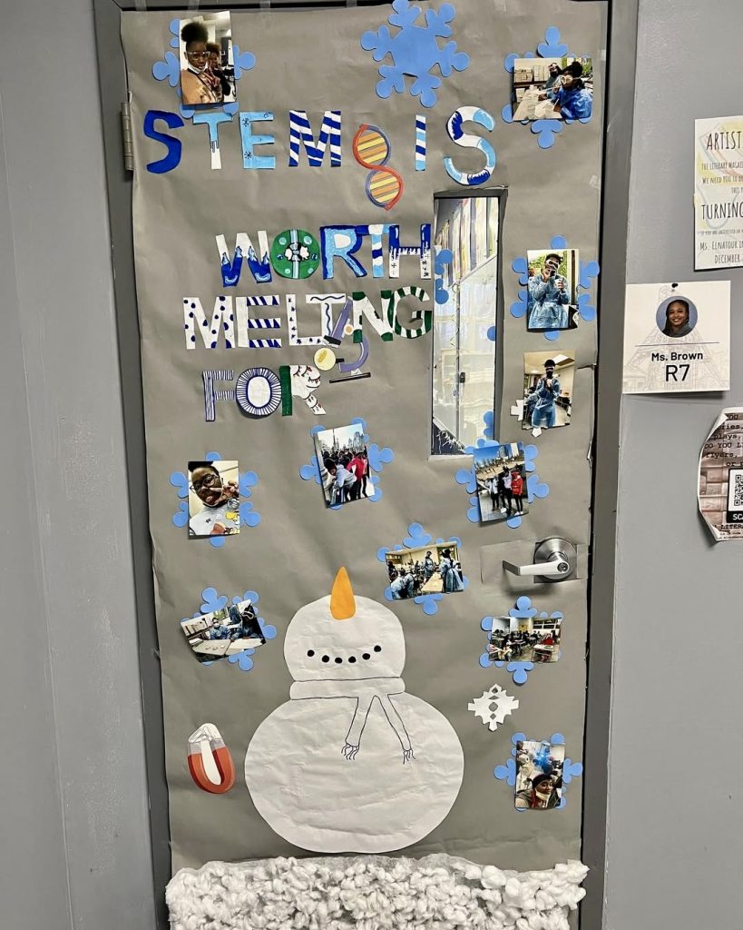 Inspired by Olaf’s famous line, this door declares “STEM is Worth Melting For,” incorporating student photos and science-themed cutouts. It’s a creative way to promote curiosity and academic excitement in Science or Math classrooms, proving that winter decor can be both fun and educational.