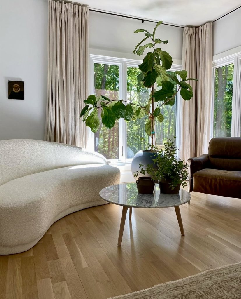 A sculptural curved sofa in crisp white introduces a modern artistic flair, complemented by raw wooden floors and dramatic floor-to-ceiling drapes that soften the atmosphere. A large potted plant infuses the room with earthy vitality, creating a bohemian sanctuary without straying from minimalist principles. The marble coffee table top and layered greenery reflect 2026’s trend toward intimate, nature-inspired interiors.
