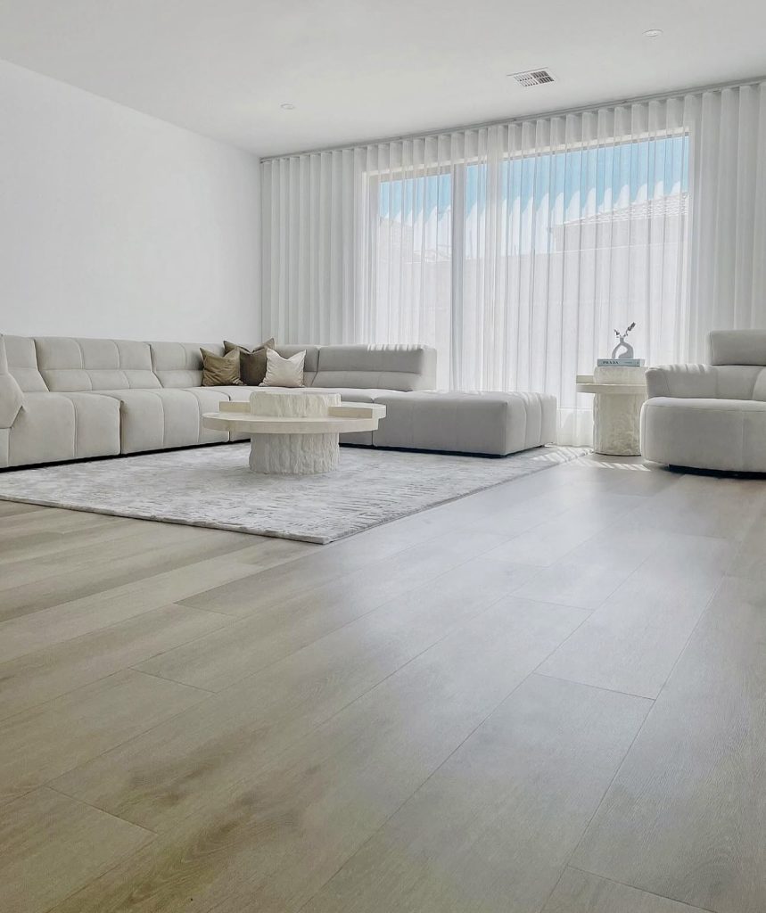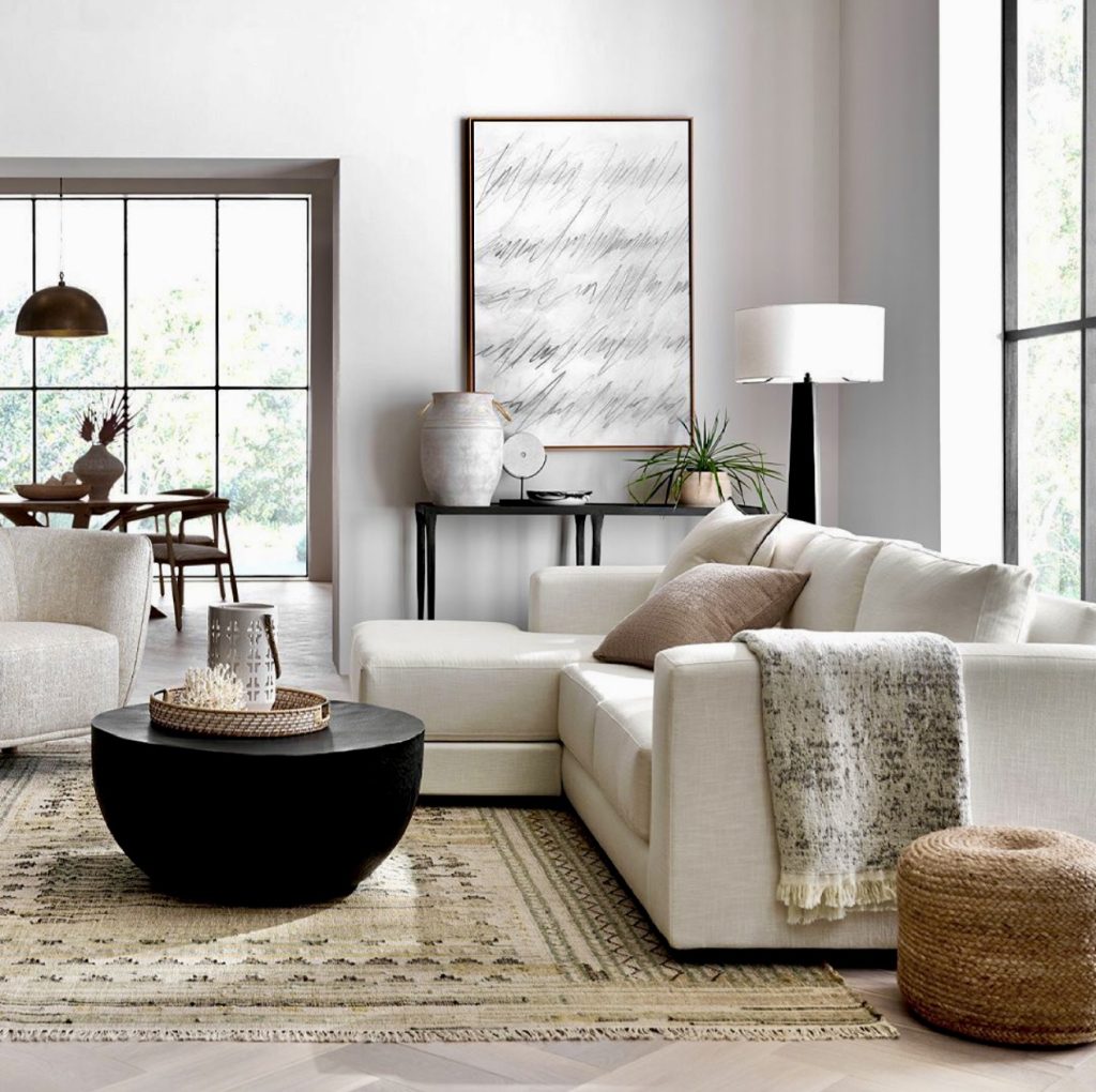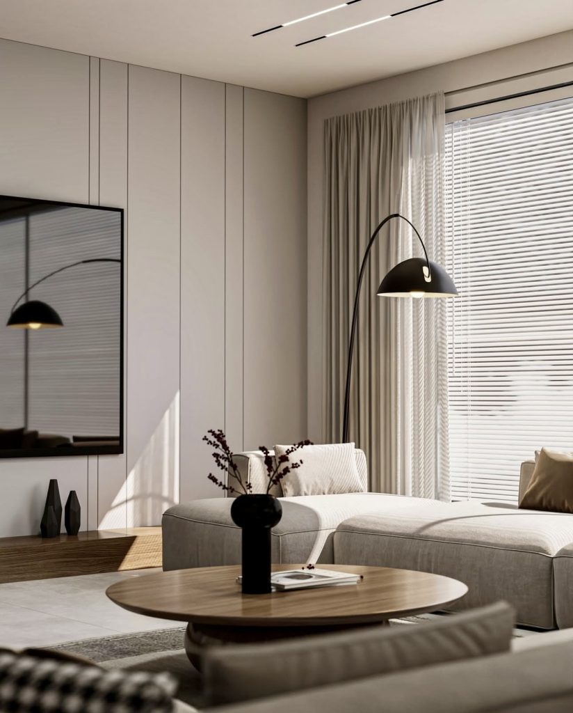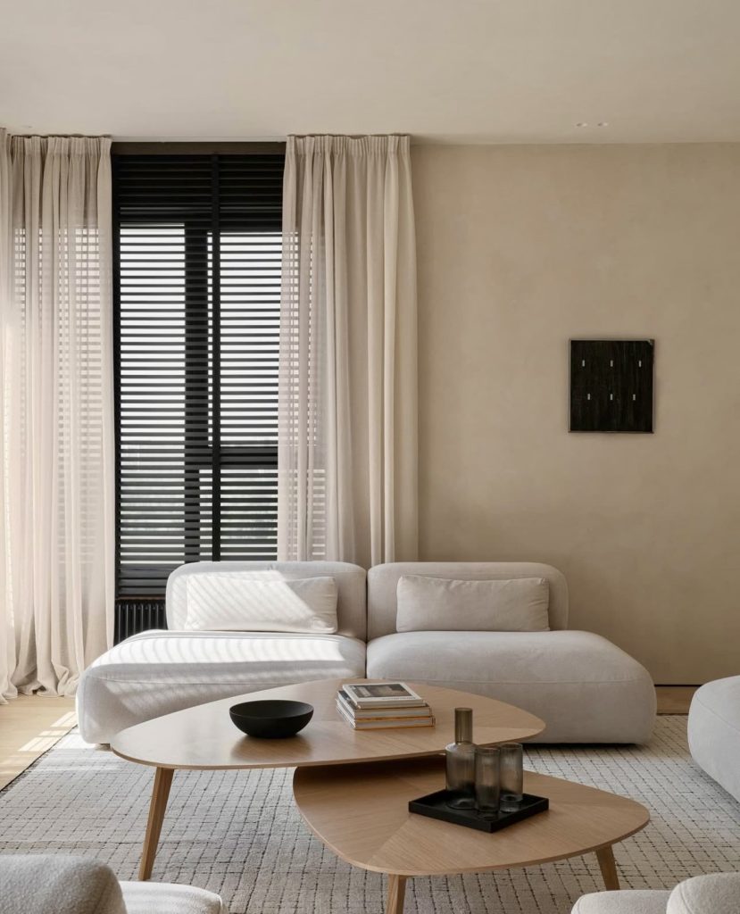 Clean lines and minimal detailing define this modern neutral space. A pale sectional sofa pairs beautifully with a sculptural wooden coffee table, while black shutters add a subtle moody contrast. This design exemplifies furniture arrangement ideas that prioritize comfort and simplicity, offering a serene environment suitable for both expansive homes and compact apartments.