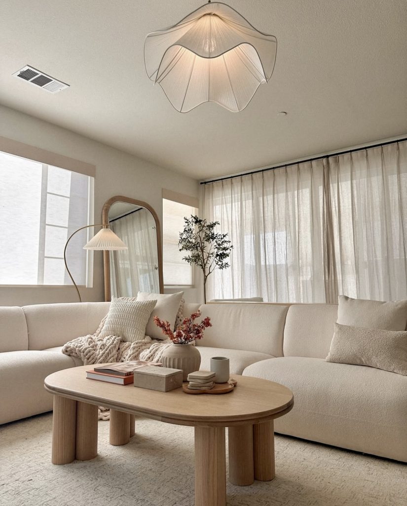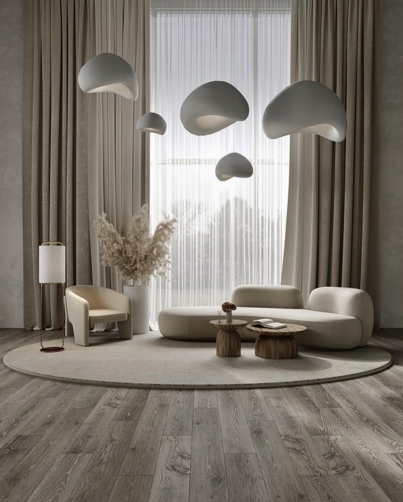 Featuring softly curved sofas, an organic pendant light, and layered rugs, this Scandinavian-inspired room offers a serene retreat. The white and beige color scheme allows the space to breathe, while natural wood accents add a subtle bohemian touch. This layout is perfect for small apartments, demonstrating how thoughtful 2026 decor ideas can make limited spaces feel open and polished.