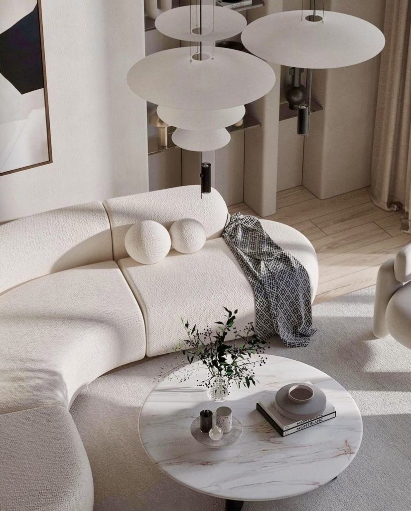 The combination of a curved sofa and layered pendant lighting transforms this minimalist space into an eclectic showcase. Soft white upholstery paired with marble accents creates a harmonious blend of modern neutrality and artistic expression. This design is perfect for those who appreciate bohemian creativity within a clean, structured setting—demonstrating that 2026 decor ideas can be both minimalist and visually dynamic.