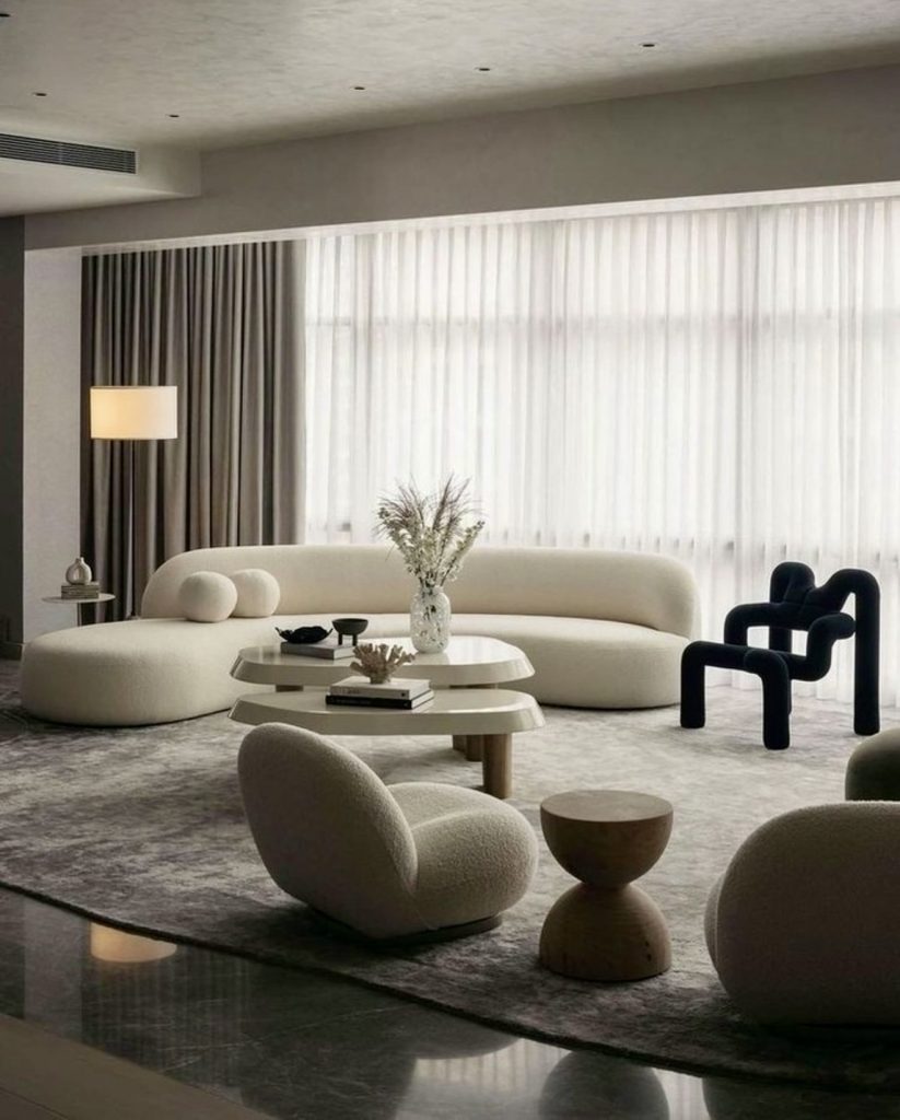 Featuring rounded furniture shapes that encourage fluid movement, this living room balances modernity with artistic flair. Creamy neutral tones provide a calming base, while a bold black accent chair introduces a striking contrast. Layered textures in the rug and coffee tables offer inspiration for those aiming to blend softness with standout details in their apartment decor ideas for 2026.