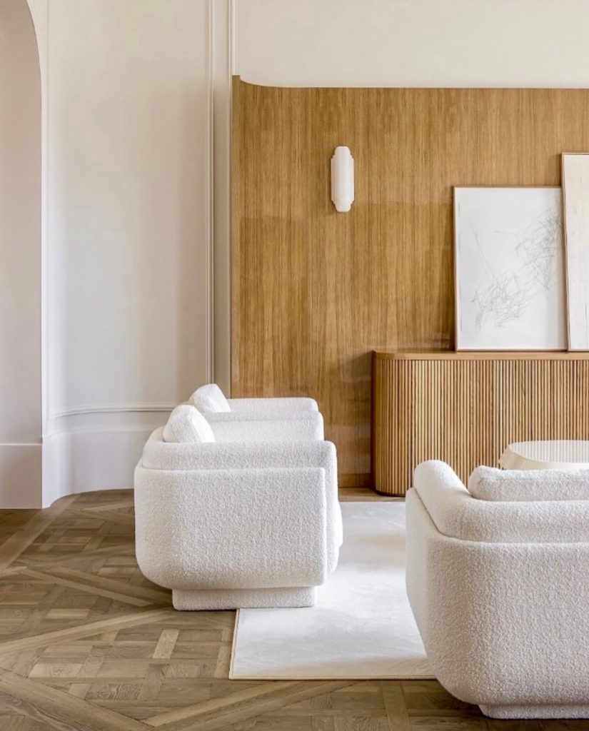 Wood paneling and cream boucle chairs create a dialogue between mid-century tradition and modern sophistication. The light oak backdrop adds earthy richness, while the sculptural seating maintains clean minimalist lines. This design offers fresh decor ideas for 2026, perfect for those wanting to blend architectural character with contemporary restraint.