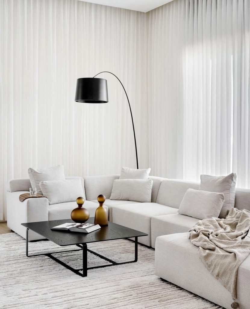 Dominated by clean white tones softened by plush textiles and a textured rug, this contemporary design balances light and dark elements. The sectional sofa offers practical furniture arrangement ideas, while an oversized black floor lamp and dark coffee table provide striking contrast. This interplay creates a cozy yet visually engaging atmosphere, ideal for apartment decor enthusiasts.