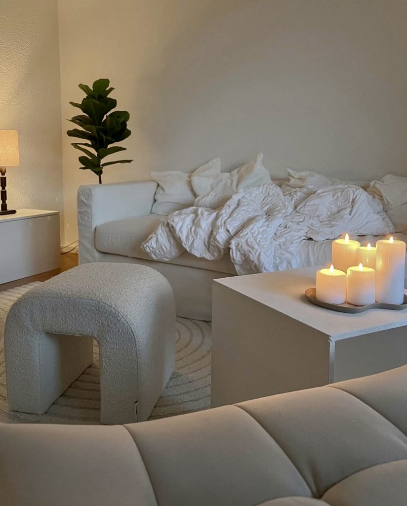 This room exemplifies how minimalist living can be deeply cozy, with candlelight adding a soft, inviting glow. A white sofa and textured ottoman create a neutral foundation, while throws and candles infuse warmth and intimacy. This approach highlights that 2026 apartment decor ideas focus not just on aesthetics but on crafting meaningful, comfortable moments.