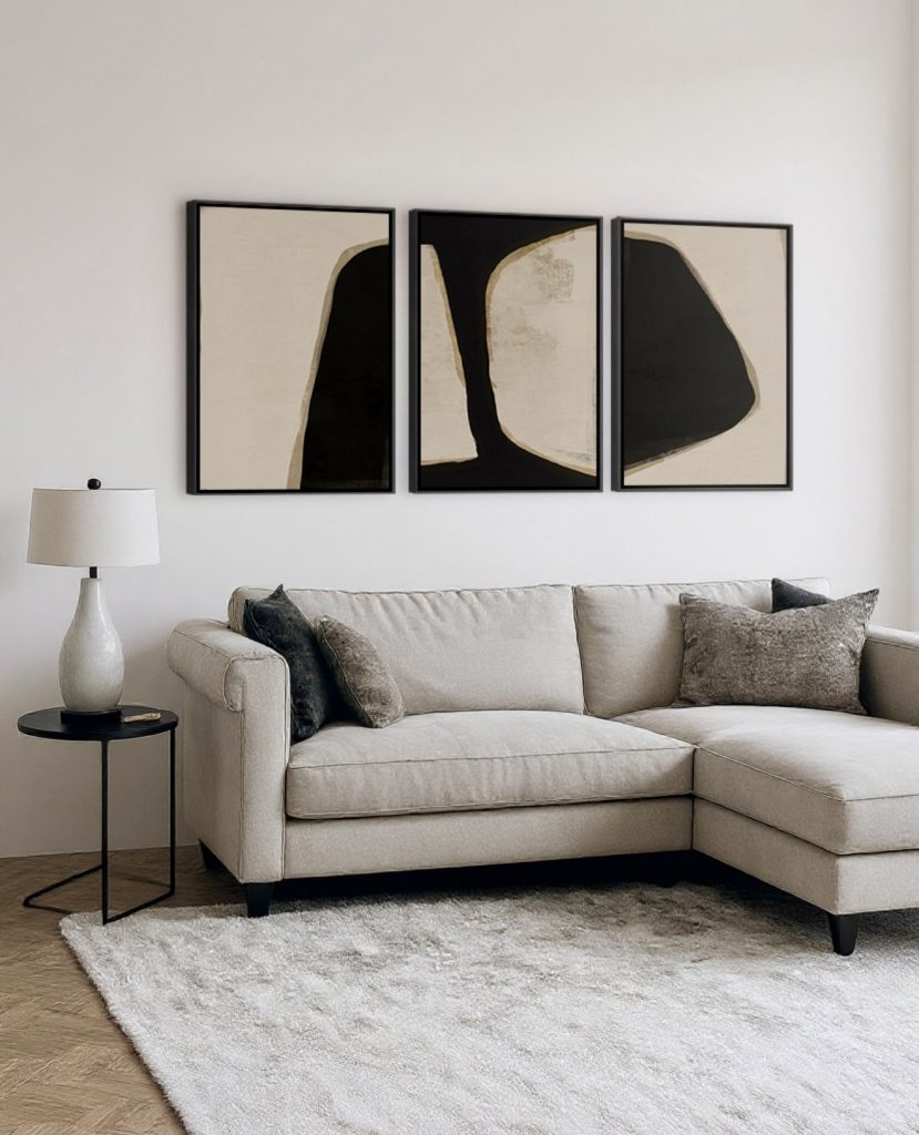 A classic sectional anchors this contemporary living room, while bold abstract wall art in black and beige introduces dramatic contrast. The calm grey and neutral palette balances the intensity of the artwork, adding depth and character. This furniture arrangement idea suits those seeking minimalist living rooms that are simple yet impactful.
