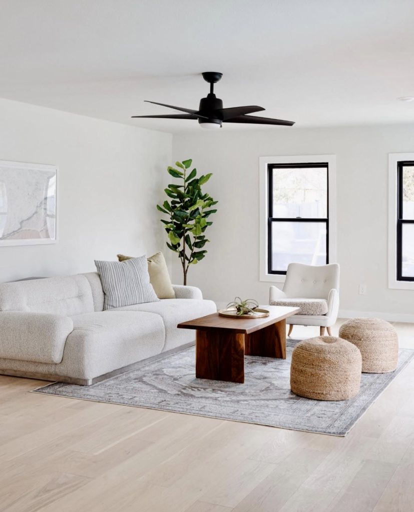 Light wood floors, white walls, and clean-lined seating form a timeless Scandinavian base. Natural textures in woven stools and rugs introduce a warm bohemian vibe, creating a space that feels both airy and lived-in. This is a prime example of how minimalist living rooms with dining areas can maintain openness while embracing comfort.
