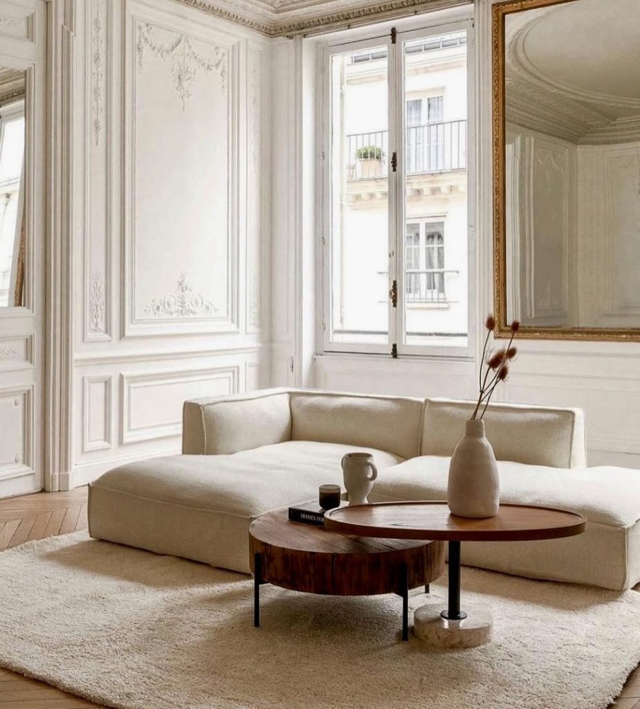Ornate moldings meet sleek, low-profile modern sofas in this space that blends bohemian charm with mid-century influences. A sculptural wooden coffee table lifts the soft white palette, striking a balance between heritage and contemporary minimalism. This design is a compelling example for those seeking apartment decor ideas in 2026 that honor historic architecture while embracing modern simplicity.