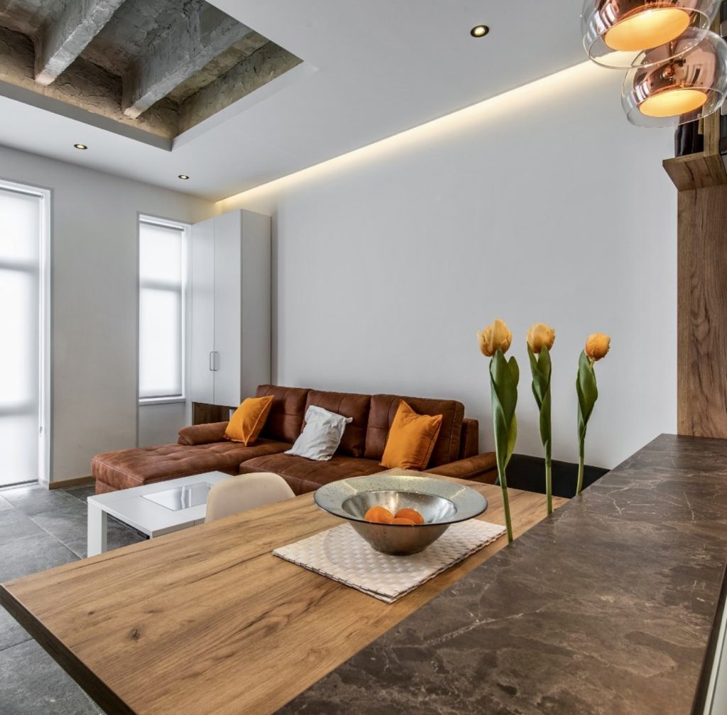 Bright orange pillows on a brown sectional sofa energize this modern apartment, lifting the mood with vibrant pops of color. The sleek kitchen bar and surfaces maintain a minimalist aesthetic while ensuring practicality. This design is perfect for those seeking bold yet cozy decor ideas in 2026 that enhance everyday living.