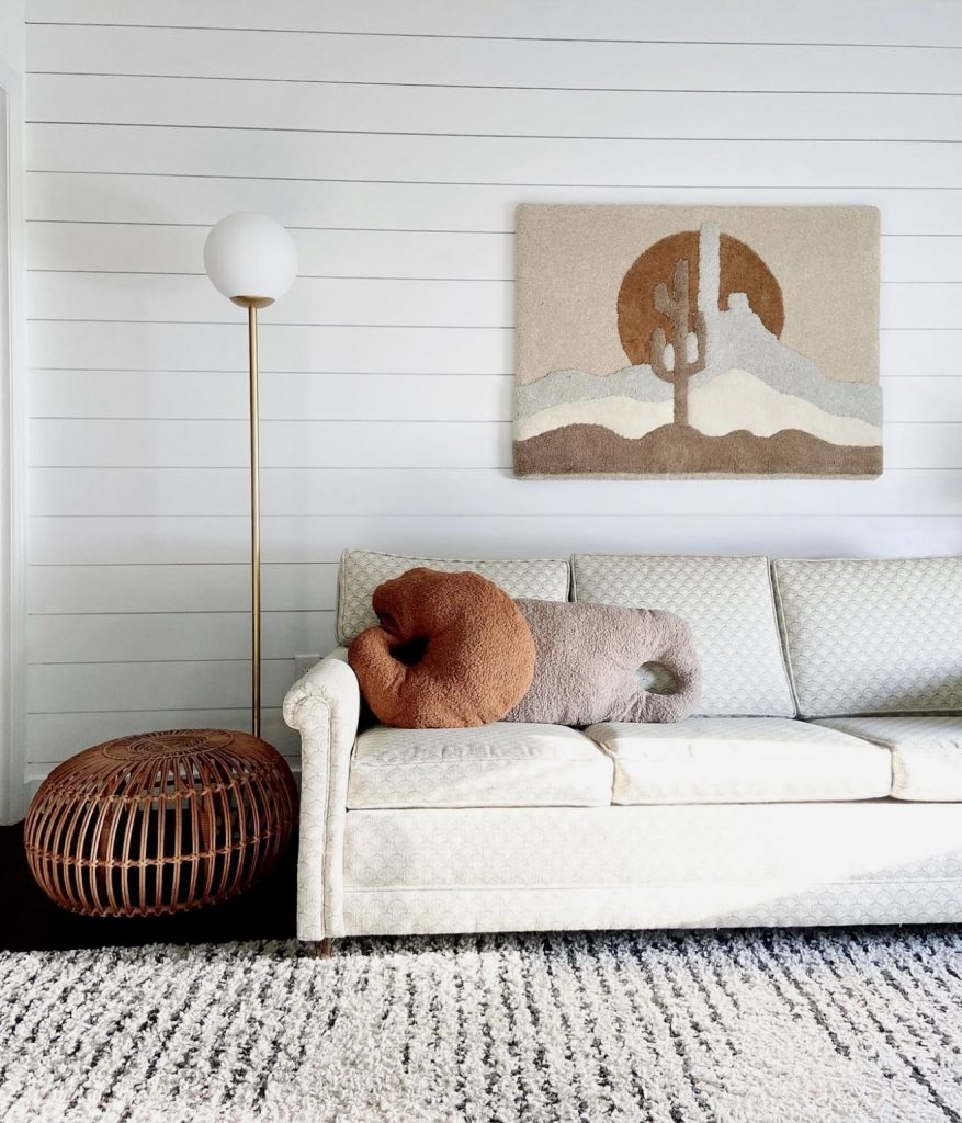 Textured wall hangings and rattan accents infuse this neutral space with bohemian energy, framed by patterned rugs. A mix of plush pillows and quirky shapes creates a playful, cozy atmosphere. This eclectic take on minimalist living room ideas proves that stripped-back design can still feel vibrant and inviting.