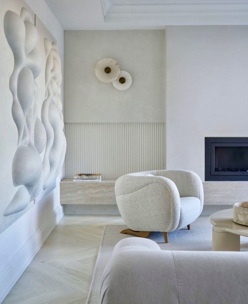 Sculptural wall art and rounded seating create a gallery-like atmosphere in this contemporary living room. Soft white tones highlight textures, while organic shapes maintain visual interest without clutter. This design is ideal for those seeking a minimalist living room that doubles as a creative sanctuary where furniture and art coexist harmoniously.