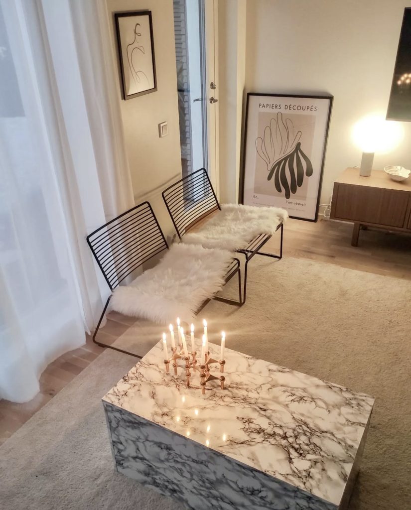 This Scandinavian-inspired space features simple wire-frame chairs layered with sheepskin for added coziness, paired with a bold marble coffee table that introduces modern drama. Soft lighting and a neutral palette keep the room serene and versatile, making it suitable for both small apartments and larger homes. It exemplifies 2026 decor ideas that blend comfort with refined detailing.