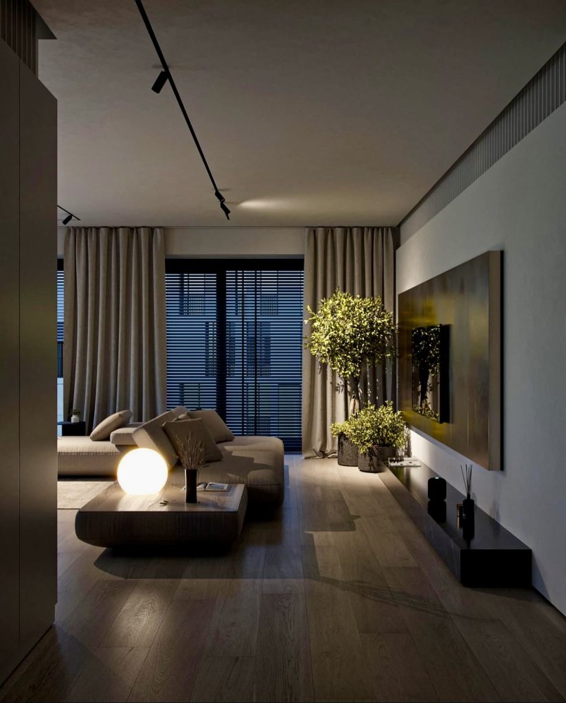 Layered curtains, sleek lines, and atmospheric lighting create a dark, moody vibe reminiscent of a cinematic set. Low-profile sectional seating paired with a glowing orb lamp offers a dramatic yet cozy atmosphere—ideal for urban apartment decor ideas in 2026. This design proves that minimalist living rooms need not be brightly lit to feel intimate and inviting.