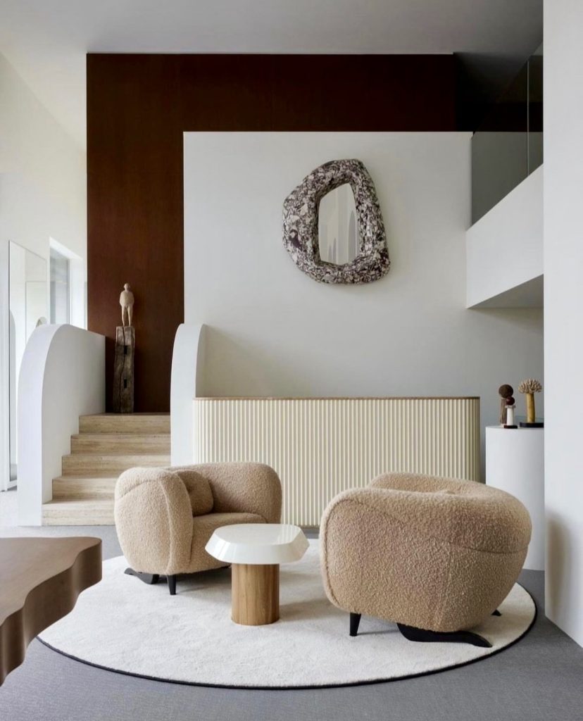 Rounded boucle chairs rest on a sharply defined circular rug, framed by sculptural architecture and a striking abstract mirror. The combination of textures and colors is modern yet whimsically eclectic, demonstrating how 2026 decor ideas can embrace individuality while maintaining minimalism. This is a stunning example of how furniture arrangement can elevate minimalist spaces into expressive environments.