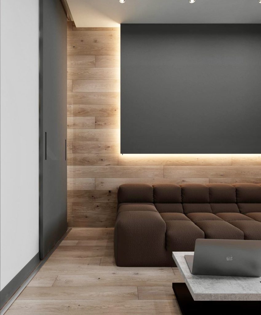 Wood-paneled walls and a deep brown modular sofa imbue this space with grounding energy. Subtle hidden lighting softens the modern neutral palette, blending sleekness with warmth. This design reminds us that minimalist living rooms can be both simple and indulgent, offering cozy corners for relaxation without clutter.