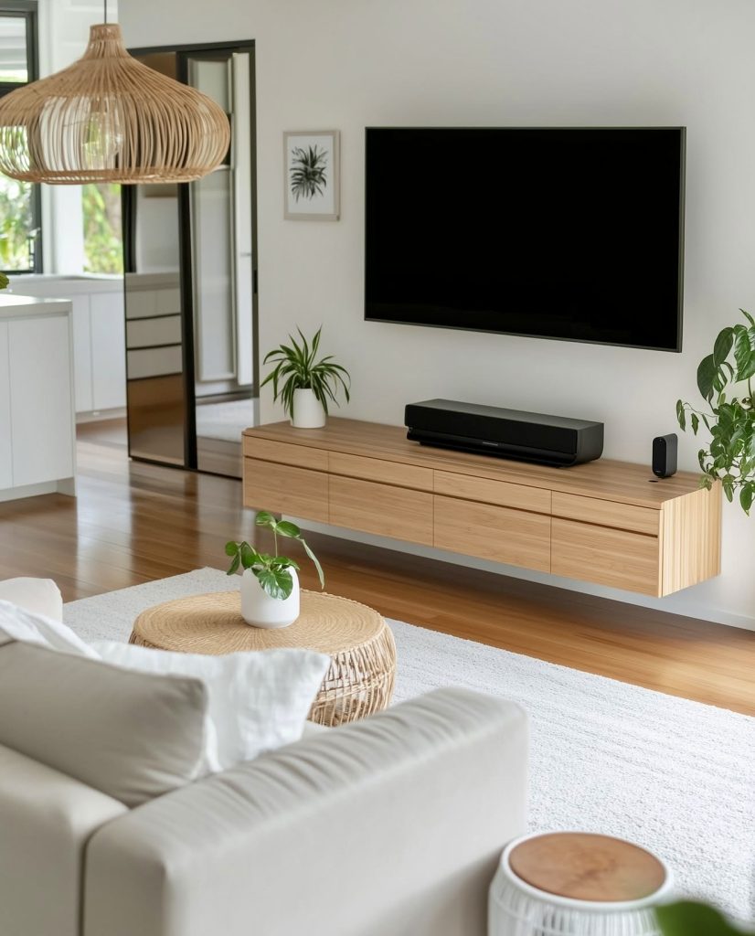 This living room showcases a Scandinavian-inspired aesthetic featuring warm wooden flooring and a sleek floating console that enhances the sense of openness. A plush white rug anchors the space, while verdant plants introduce a refreshing natural element. The woven pendant light adds a layer of texture, striking a perfect balance between bohemian simplicity and inviting warmth—ideal for anyone reimagining their apartment decor in 2026.