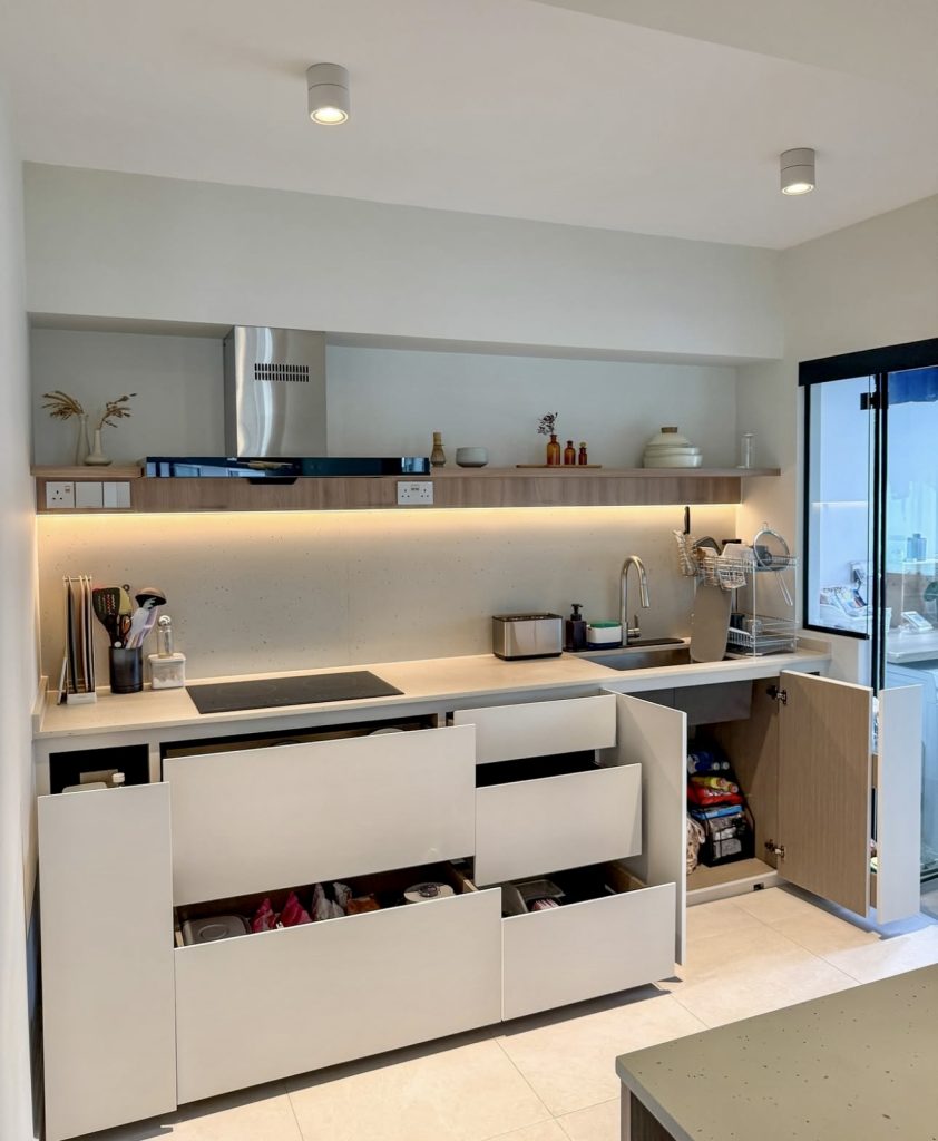 In this sleek modular kitchen, hidden drawers keep pantry items and cleaning supplies out of sight, preserving a clutter-free countertop. Subtle under-shelf lighting adds ambiance and functionality during meal preparation. This minimalist design, featuring clean lines and neutral hues, fits perfectly in industrial or farmhouse-inspired spaces, balancing efficiency with modern aesthetics. It’s an ideal setup for weekday cooking and weekend entertaining alike.