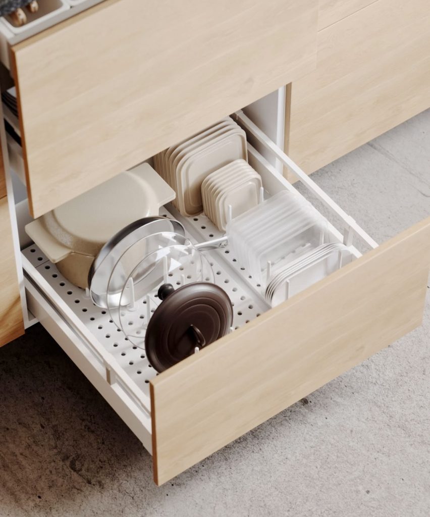This innovative deep drawer employs a pegboard system to neatly arrange square plates, glass lids, and Dutch ovens, ensuring each item has a secure spot. Particularly effective in modular kitchens where adaptability is key, this design enhances both safety and order. Its neutral color palette complements Scandinavian and minimalist interiors, making it a stylish and practical addition to apartments lacking upper cabinets.