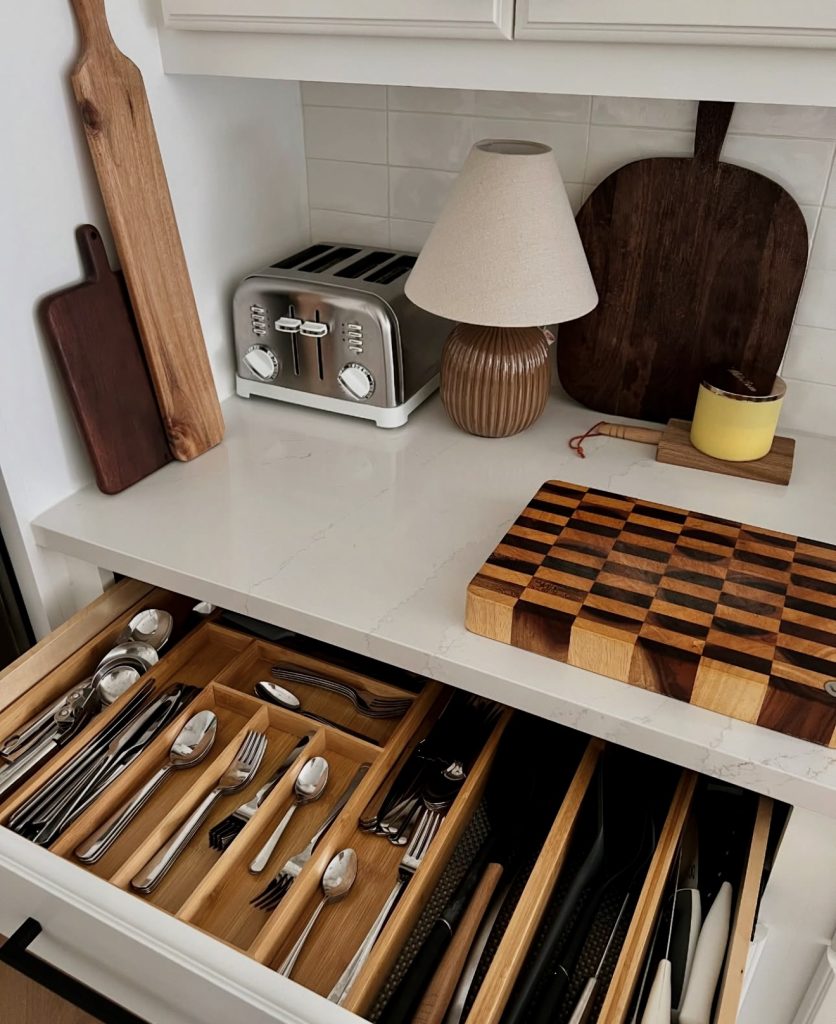 Nothing beats the satisfaction of a well-organized cutlery drawer. This setup uses natural bamboo dividers arranged in two tiers, doubling storage capacity within the same drawer footprint. Every utensil—from spoons and forks to kitchen shears and long-handled tools—has its designated place. The countertop above features a curated vintage farmhouse aesthetic with wooden cutting boards, a classic lamp, and a retro toaster, blending utility with nostalgic charm.