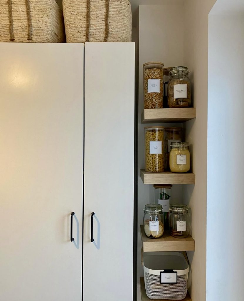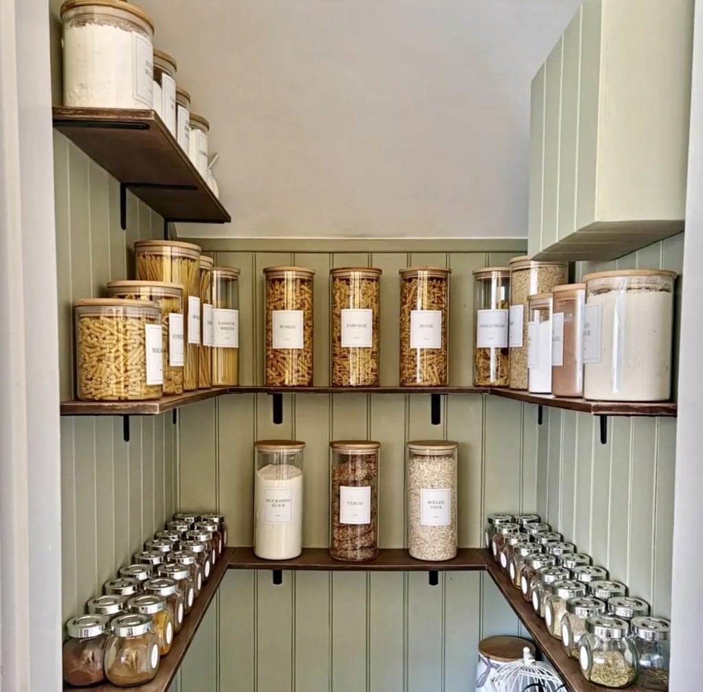 Utilizing vertical corners effectively, this pantry design employs wall-mounted shelving to display uniform clear containers labeled for essentials like flour, grains, pasta, and spices. Ideal for compact apartments or prefabricated kitchens, this setup harmonizes functionality with visual appeal. The orderly rows of jars evoke a calm, organized atmosphere, enhanced by sage green paneling reminiscent of countryside homes. Smaller spice jars positioned on lower shelves ensure easy access without overwhelming the space, striking a perfect balance between style and everyday convenience.