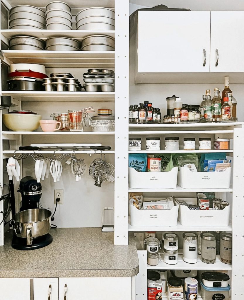 This versatile kitchen corner combines baking, preparation, and dry storage into a unified area. Open shelves house baking tins and mixing bowls, while a mounted stand mixer keeps countertops clear. Labeled jars and bins make ingredient identification quick and easy, perfect for frequent bakers. The use of simple containers and baskets lends a DIY charm, balancing budget-consciousness with professional organization. This model exemplifies how compact spaces can be optimized for maximum storage efficiency.