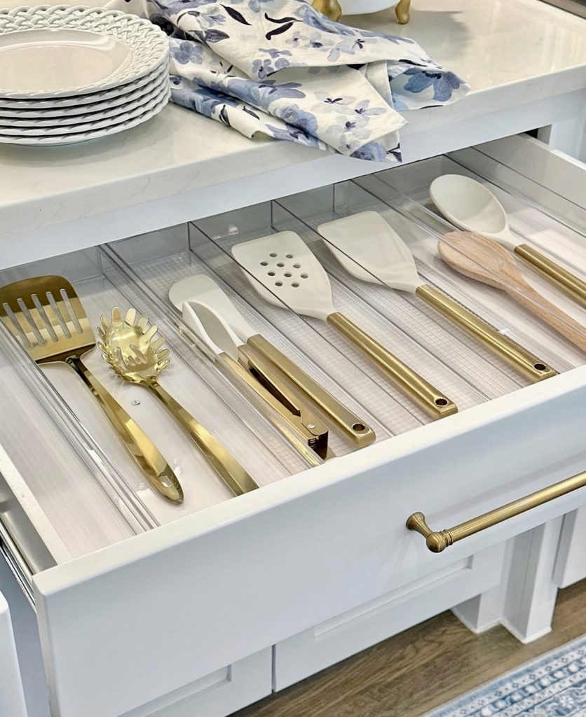 Exuding refined functionality, this utensil drawer showcases gold-accented cooking tools nestled within clear acrylic dividers. The combination of white cabinetry and metallic highlights complements both modern and traditional kitchen styles, including those inspired by Indian aesthetics with a touch of glamour. This setup is achievable with DIY inserts, proving that luxury organization can be simple and accessible.