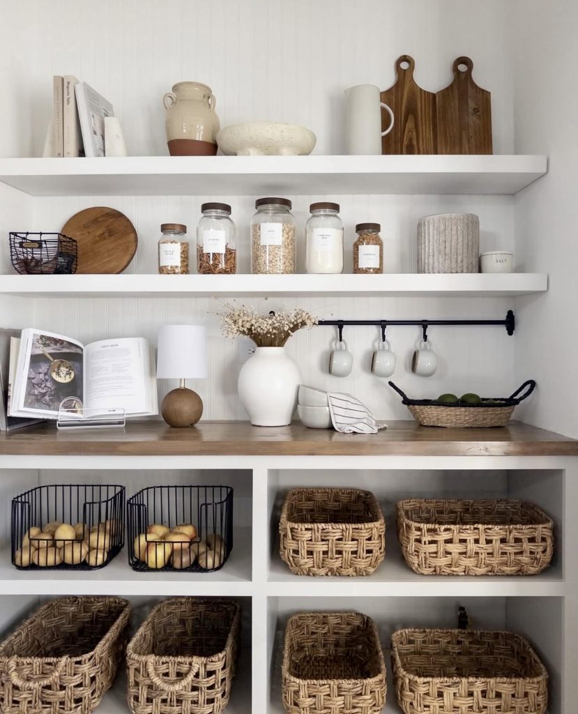 Natural Open Shelving with Baskets and Pantry Jars