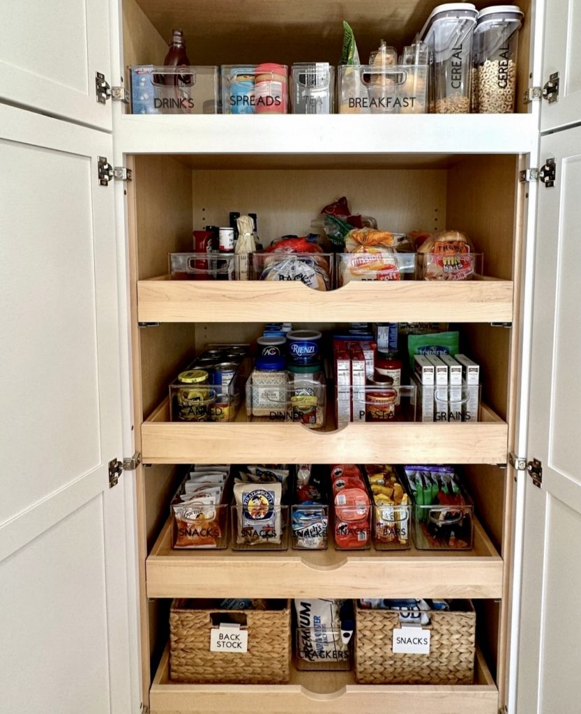 Clarity is key in this pantry, where labeled clear bins categorize snacks, spreads, and dinner essentials. Each pull-out shelf serves as an inventory station, offering both accessibility and control. Lower baskets labeled for back stock enhance practicality and affordability, making this design ideal for modular or Scandinavian-inspired kitchens seeking a clean, unobtrusive look.