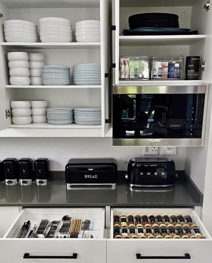 Monochrome Dishware and Spice Storage Integration