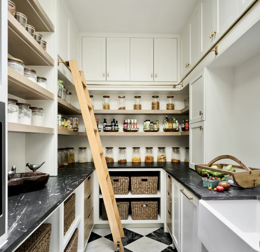 Walk-In Pantry with Ladder and Luxurious Black Marble Counters
