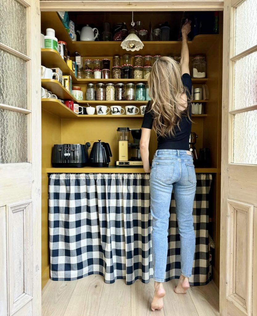 This cozy coffee nook blends open shelving, vintage mismatched mugs, and retro-style jars reminiscent of classic tea and dry goods advertisements. A soft curtain conceals additional storage, adding warmth and softness to the space. The bohemian and farmhouse elements create an inviting atmosphere where functionality meets heartfelt design.