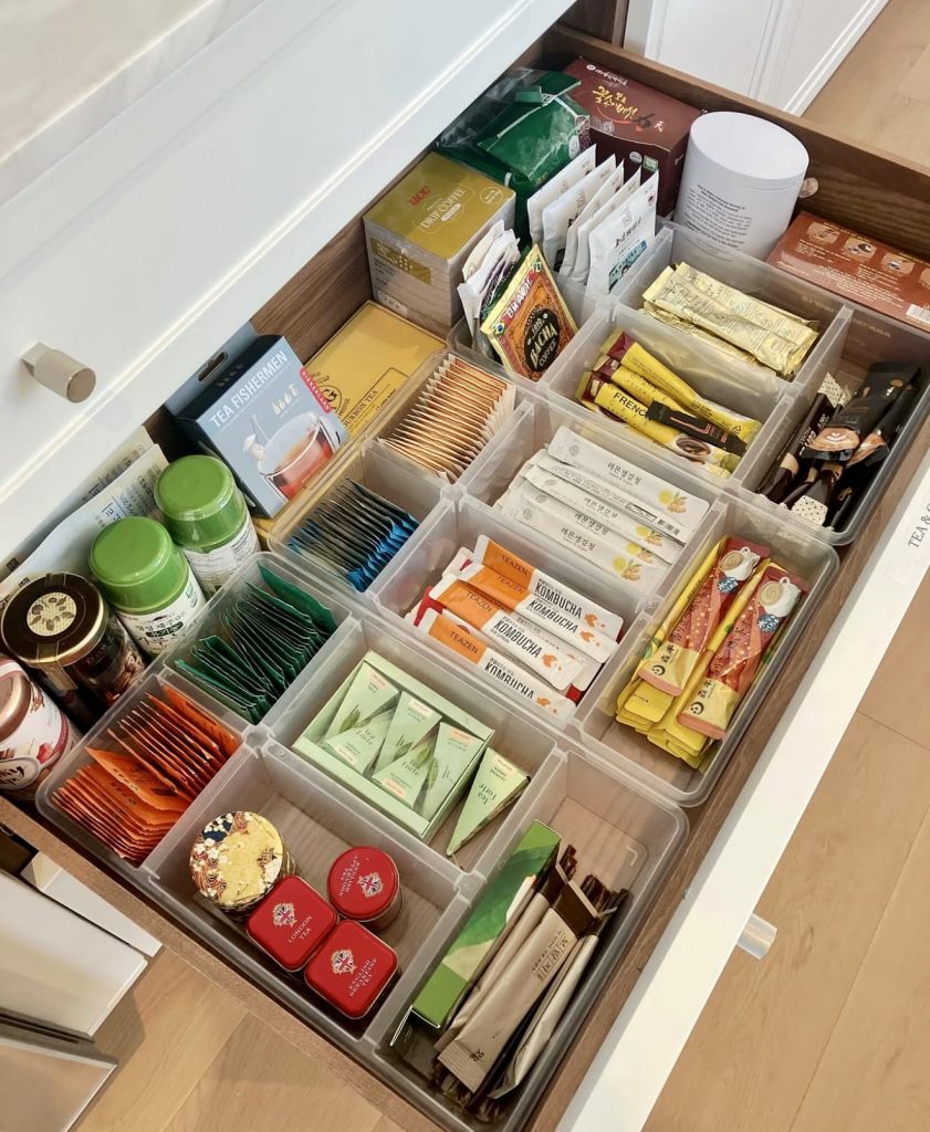 Perfect for tea lovers and instant coffee fans, this drawer uses clear acrylic organizers to neatly separate sachets, tins, and stick packets. The system is both boutique-worthy and highly functional, reducing clutter and turning beverage preparation into a calming ritual. The color-coded arrangement adds a soothing symmetry, enhancing the overall kitchen experience.