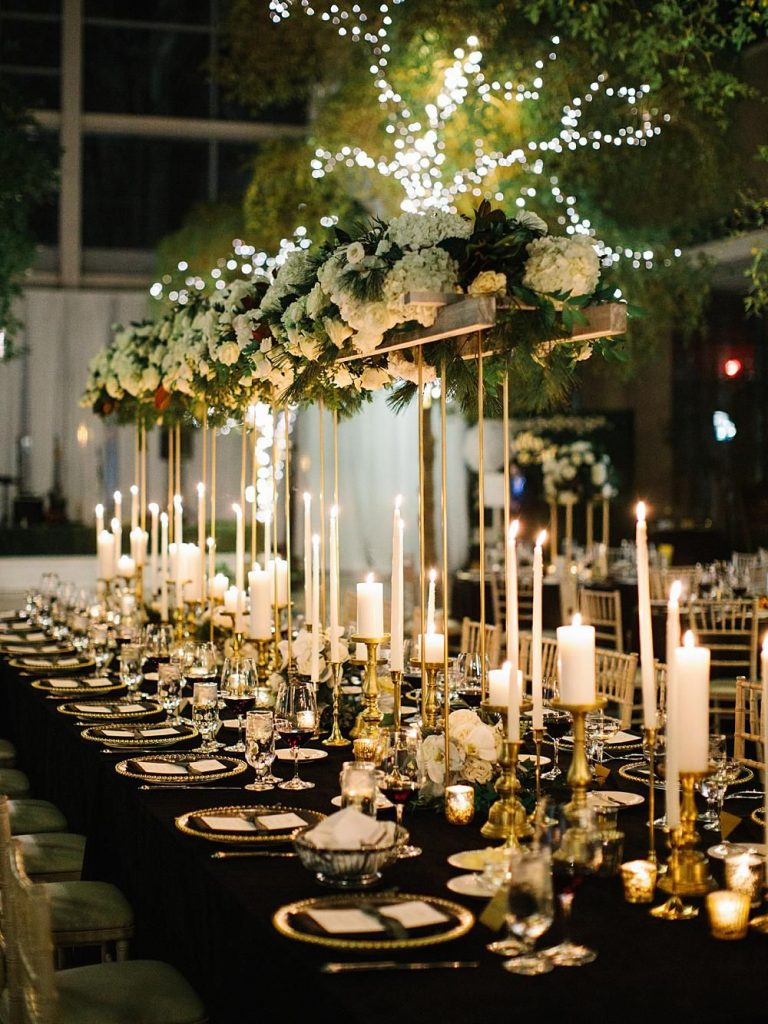 A banquet-style table lined with glowing candles and fresh floral arrangements creates an intimate yet dramatic setting. The interplay of soft lighting with glassware and metallic accents enhances a refined color scheme of ivory, gold, and black. This design complements a black-tie dress code, encouraging guests to wear elegant evening gowns and tuxedos that match the formal atmosphere.