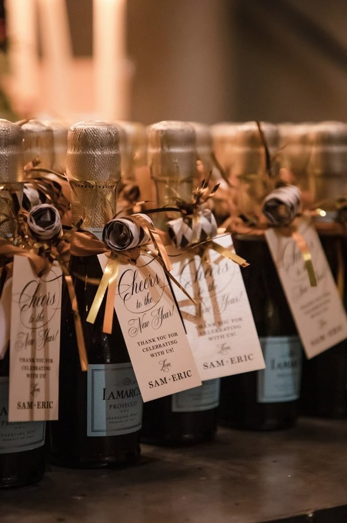 Miniature champagne bottles make for elegant and practical wedding favors, perfect for a New Year’s Eve send-off. Adorned with gold ribbons and custom tags, these gifts double as part of your decor and add a cohesive touch to your color scheme. Placing a bottle at each guest’s seat surprises and delights, ensuring the midnight toast is both stylish and memorable. As highlighted by leading wedding experts, favors that guests can enjoy long after the celebration are always a hit.